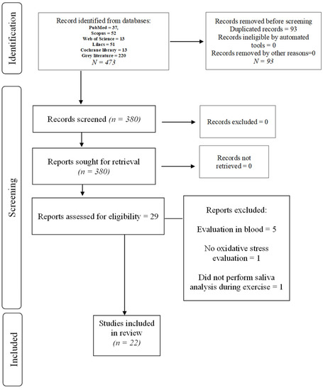 Among the 473 references identified in searching databases, 93 duplicates were removed. After reading titles and abstracts, 351 references were excluded based on the eligibility criteria; thus, 29 were selected for full-text appraisal. After that, seven studies were excluded: 5 studies conducted their oxidative stress evaluation in the blood, not in saliva [25,26,27,28,29]; one study did not perform salivary evaluations during exercise intervals [30]; and 1 article did not analyse oxidative stress parameters [31].For reasons for excluding articles, please see Supplementary Table S3. Finally, 22 articles were eligible for qualitative assessment (Figure 1).