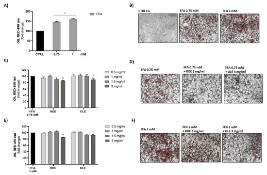 Human liver cells (HepG2) treated with FFA were used as a model of hepatic steatosis. As shown in Figure 3A,B, increasing concentrations of FFA (0.75–1 mM) caused an increasing accumulation of lipid droplets. Only at a concentration of 3 mg/mL were both OLE and ROE able to reduce the lipid drops accumulation caused by the treatment of HepG2 cells with 0.75 and 1 mM FFA, while at the lowest concentrations this effect was not evident (Figure 3C–F).