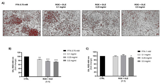 However, since only high extract concentrations (3 mg/mL) were able to reduce lipid accumulation, we decided to investigate if the co-treatment of HepG2 cells with lower concentrations of the two extracts could have a synergistic effect. All lower concentrations tested significantly reduced lipid droplet accumulation obtained with 0.75 mM FFA but not those obtained with 1 mM FFA. Therefore, 0.75 mM FFA concentration could represent the best condition to further investigate molecular mechanisms involved in the beneficial effect of OLE and ROE in preventing lipid accumulation.