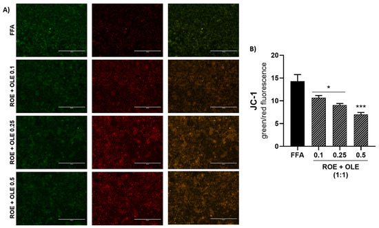(A) Fluorescence images of JC-1 staining after 6 h of treatment. (B) Effect of ROE and OLE combinations on mitochondrial membrane potential. Significant vs FFA: * p < 0.05; *** p < 0.0005.