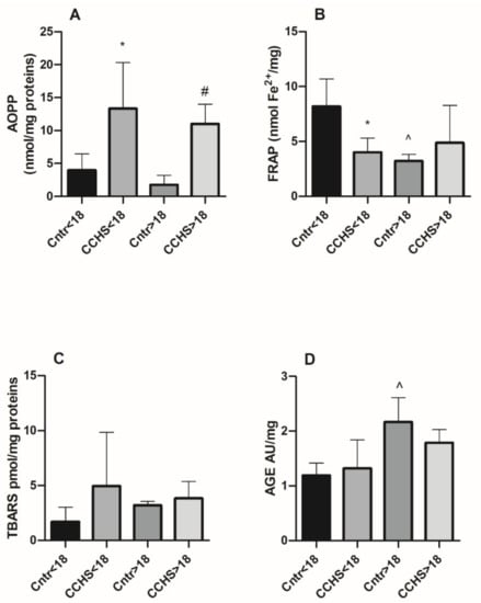 Levels of serum (A) AOPP, (B) FRAP, (C) TBARS, and (D) AGEs in healthy controls (Cntr) and CCHS patients aged <18 years and >18 years. Data are expressed as the mean ± SEM. * p < 0.05 vs. healthy minors; # p < 0.05 vs. healthy adults; ^ p < 0.05 vs. healthy minors.