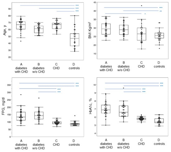 Clinical and metabolic data evaluated in the four groups of subjects. In the box plot, the ends of the box represent the 1st and 3rd quartile, respectively. Each box is divided by a line, which represents the median value. The whiskers show the values corresponding to [1st quartile−1.5 × (interquartile range)], and [3rd quartile + 1.5 × (interquartile range)]. Horizontal blue lines on the top part of the graph indicate post hoc comparisons between groups by Tukey’s HSD test, following significant ANOVA. BMI, body mass index; CHD, coronary heart disease; FPG, fasting plasma glucose; HbA1c, glycated hemoglobin. *** p < 0.001; ** p < 0.01; * p < 0.05.
