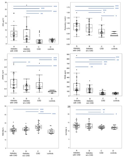 Glycation and oxidation parameters evaluated in the four groups of subjects. In the box plot, the ends of the box represent the 1st and 3rd quartile, respectively. Each box is divided by a line, which represents the median value. The whiskers show the values corresponding to [1st quartile − 1.5 × (interquartile range)], and [3rd quartile + 1.5 × (interquartile range)]. Horizontal blue lines on the top part of the graph indicate post hoc comparisons between groups by Tukey’s HSD test, following significant ANOVA. AGE, advanced glycation end products; GLY-HSA, glycated albumin; RAGE, receptor for advanced glycation end-products; sRAGE, soluble RAGE; THIO-HSA, thiolated albumin; CHD, coronary heart disease *** p < 0.001; ** p < 0.01; * p < 0.05.