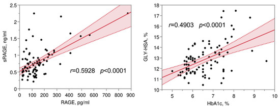 Scatter plot of variables presenting the most relevant correlations among those reported in Supplementary Table S2. Each plot shows a fitted linear regression line with a shaded 95% confidence interval. GLY-HSA, glycated albumin; RAGE, receptor for advanced glycation end-products; sRAGE, soluble RAGE; HbA1c, glycated hemoglobin.