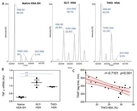 Albumin isoforms and functional effects. (A) Mass spectrometry analysis of regenerated HSA (native HSA-SH), highly glycated albumin (GLY-HSA), and highly thiolated albumin (THIO-HSA). (B) TNFα mRNA levels, normalized to the housekeeping gene 18S rRNA, in U937 cells incubated with native HSA-SH, GLY-HSA, and THIO-HSA 100 µg/mL for 2 h. ** p < 0.01 vs HSA-SH. (C) Correlation of THIO-HSA and plasma antioxidant activity measured by means of TRAP assay. Plot shows fitted linear regression line with shaded 95% confidence interval.
