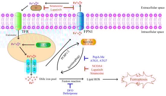 Treating of cells with erastin and RSL3-induced ferroptosis with PepA-Me has been shown to increase ferritin protein expression levels and reduce iron concentration, indicating that PepA-Me may prevent ferroptosis by blocking the autophagic degradation of ferritin [41]. Moreover, lapatinib, a kinase inhibitor, and siramesine, a lysosomotropic modulator, have been reported to induce ferroptosis by increasing iron levels, reducing ferroportin expression, and increasing transferrin expression [34] (Table 1).