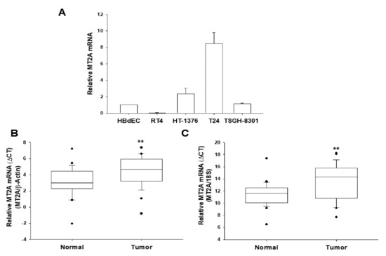 Expression of MT2A in human bladder tissues and cells. (A) The expression of MT2A in bladder cells was determined through RT-qPCR assays (±SE, n = 3). The numbers of mRNA levels indicated the ratio of MT2A/β-Actin in relation to HBdEC cells. RT-qPCR assays using β-Actin (B) or 18S (C), respectively, as the internal control, was conducted to quantitatively analyze the MT2A mRNA levels in paired bladder cancer and normal tissues. The comparison of the MT2A expressions in normal bladder and cancer tissues was examined by box plot analysis (n = 26). ** p < 0.01.