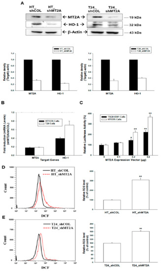 MT2A modulates the heme oxygenase-1 and endogenous reactive oxygen species in bladder carcinoma cells. (A) Protein levels of MT2A and HO-1 after knockdown of MT2A in HT1376 (left) and T24 (right) cells were examined by immunoblot assays. The quantitative data are presented as the intensity of the protein bands of the target proteins/β-actin relative to the mock-knockdown cells (bottom). (B) Relative fold-induction mRNA levels of MT2A and HO-1 in HT_shMT2A and T24_shMT2A cells compared with HT_shCOL and T24_shCOL cells, respectively, determined by using RT-qPCR assays. (C) Relative luciferase activity of HO-1 reporter vector after co-transfection with various concentrations of MT2A expression vector in TSGH-8301(black bars) and HT1376 (white bars) cells (±SE, n = 6). The endogenous ROS levels in HT_shCOL, HT_shMT2A (D), T24_shCOL, and T24_shMT2A (E) cells were measured by flow cytometry. * p < 0.05; ** p < 0.01.