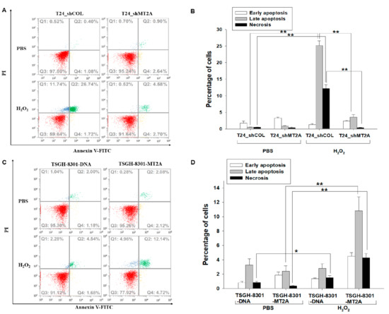 We distinguished early apoptotic, late apoptotic, and necrotic cells by annexin V-FITC in conjunction with PI staining. The fluorescence intensity of annexin V-FITC and PI in T24_shCOL and T24_shMT2A cells after 500 μM of H2O2 treatment for 3 h displayed that MT2A knockdown in T24 cells (T24_shMT2A) was significantly resistant to H2O2-induced cell apoptosis compared to the mock-knockdown (T24_shCOL) cells (Figure 3A). Quantitative analysis indicated that T24_shCOL cells, as well as T24_shMT2A cells, with H2O2 treatment did not significantly affect the percentage of cells in early apoptosis. However, MT2A knockdown significantly resisted H2O2 treatment-induced late apoptosis (25.17% vs. 3.55%) and necrosis (12.17% vs. 0.38%) of T24_shCOL cells in comparison to T24_shMT2A cells (Figure 3B). Inversely, the ectopic overexpression of MT2A in TSGH-8301 cells significantly enhanced H2O2-induced cell apoptosis by comparing mock-overexpression TSGH-8301 cells (Figure 3C). Quantitative analysis further confirmed that the overexpression of MT2A significantly increased H2O2 treatment-induced early apoptosis, late apoptosis, and necrosis (1.35% vs. 4.52%, 2.80% vs. 10.81%, and 1.51% vs. 4.29%, respectively) of TSGH-8301-DNA cells in comparison to TSGH-8301-MT2A cells (Figure 3D).