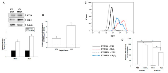 MT2A downregulated H2O2-induced ROS in bladder carcinoma HT1376 cells. (A) Protein levels of MT2A and HO-1 after overexpression of MT2A in HT1376 cells were examined by immunoblot assays (top). The quantitative data were presented as the intensity of the protein bands of the target proteins/β-actin relative to the mock-overexpressed cells (bottom). (B) Relative fold-induction of mRNA levels of MT2A and HO-1 in HT-MT2A cells compared with HT-DNA cells was evaluated by RT-qPCR assays. ROS levels (C) and quantitative data (D) of HT-DNA and HT-MT2A cells after treatment with or without H2O2 were measured by flow cytometry. * p < 0.05; ** p < 0.01.