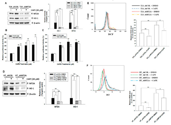 Caffeic acid phenethyl ester induces MT2A and HO-1 expressions to downregulate endogenous ROS in bladder carcinoma cells. (A) Protein levels of MT2A and HO-1 after CAPE treatments in T24_shCOL and T24_shMT2A cells were determined by immunoblot assays (left). The presented quantitative data were the intensity of the protein bands of the target proteins/β-actin relative to the mock-knockdown cells (right). The relative luciferase activity of HT1376 (black bars) and TSGH-8301 (white bars) cells were transfected with the human MT2A (B) or HO-1 (C) reporter vectors and treated with various concentrations of CAPE. Presented data were the mean percentage (±SE, n = 6) compared with the vehicle-treated cells. (D) Protein levels of MT2A and HO-1 after CAPE treatments in HT_shCOL and HT_shMT2A cells were examined by immunoblot assays (left). The quantitative values presented were the intensity of the protein bands of the target proteins/β-actin relative to the mock-overexpressed cells (right). (E) Endogenous ROS levels (left) and quantitative data (right) of T24_shCOL and T24_shMT2A after treatment with or without CAPE were determined by flow cytometry. (F) Endogenous ROS levels (left) and quantitative data (right) of HT_shCOL and HOT_shMT2A cells after treatment with or without CAPE were measured by flow cytometry. * p < 0.05; ** p < 0.01.