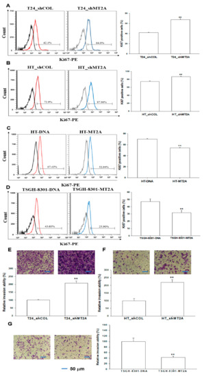 Ki67 flow cytometry showed that MT2A knockdown in T24 and HT1376 cells (T24_shMT2A and HT_shMT2A) increased the numbers of cells with Ki67 staining by 15% and 12% compared to the mock-transduced (T24_shCOL and HT_shCOL) cells, respectively (Figure 6A,B). However, the ectopic overexpression of MT2A MT2A in HT1376 and TSGH-8301 cells exhibited the opposite results. The Ki67 staining proliferation assays indicated that overexpression of MT2A in HT1376 and TSGH-8301 cells (HT-MT2A and TSGH-8301-MT2A) decreased the amount of cells with Ki67 staining by 16% and 15% compared with mock-overexpression (HT-DNA and TSGH-8301-DNA) cells, respectively (Figure 6C,D). Moreover, the Matrigel invasion assays showed a significant increase in cellular invasion in the MT2A knockdown of T24 (Figure 6E) and HT1376 cells (Figure 6F). In contrast, overexpression of MT2A significantly inhibited cell invasion in TSGH-8301 cells (Figure 6G).