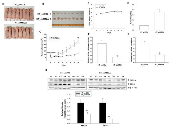 Since we determined MT2A as an antitumor gene (Figure 1) and downregulated cell proliferation in vitro (Figure 6), we continued to assess the effect of MT2A on tumor growth in vivo. We xenografted HT_shCOL and HT_shMT2A cells into the male nude mice (BALB/cAnN-Foxn1). The measurement of body weight and tumor volume was performed twice per week during the experimental period. On the 21st day after inoculation, the mice were sacrificed and the tumors were collected (Figure 7A,B). From the results, the tumors in the HT_shCOL group grew slowly compared to the tumors in the HT_shMT2A group (141.32 ± 30.60 vs. 501.15 ± 71.64 mm3) during 21 days of the experimental period (Figure 7C). However, the average body weight of the HT_shMT2A group was not significantly different from the vehicle-treated group (Figure 7D). The average tumor weight in the HT_shMT2A group was heavier than in the HT_shCOL group (0.09 ± 0.01 vs. 0.36 ± 0.02 g; Figure 7E). The mRNA levels of MT2A (Figure 7F) and HO-1 (Figure 7G) were downregulated by approximately 70% and 58%, respectively, in the xenograft tumors derived from HT_shMT2A cells compared to those derived from HT_shCOL cells. Further immunoblot assays confirmed that not only was MT2A knocked down but that the protein level of HO-1 also decreased in the xenograft tumors derived from HT_shMT2A cells (Figure 7H). Collectively, the above results suggest that MT2A knockdown in highly metastatic HT1376 cells significantly enhances the growth of tumors in the xenograft mice model.