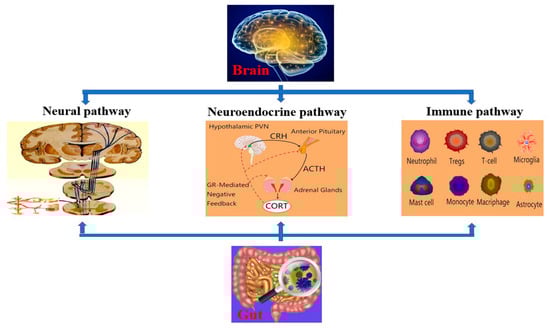 BGA, a bidirectional communication network connecting the central nervous system (CNS) and enteric nervous system (ENS) [], is mainly composed of three pathways: the neural, neuroendocrine and immune pathways (Figure 1) []. (1). The neural pathway: the bidirectional exchange between the CNS and ENS, is the basis of BGA, and the autonomic nervous system (ANS), whose main branch is the ENS, is the centre of this interaction []. The afferent nerves of these systems are in key locations throughout the gut, including the mucosal surface. Both the sympathetic and parasympathetic systems are active, and the imbalance of input induces autonomic nerve disorders, which leads to gut dysfunction []. In addition, the gut microbiome can affect the production of neurotransmitters by “de novo synthesis” or by impacting neurotransmitter-related metabolism pathways []. (2). The neuroendocrine pathway: the hypothalamus-pituitary-adrenal (HPA) axis, is the key to neuroendocrine transmission and the stress response system [,]. Both the neural and nonneural components of the HPA axis have multiple regulatory controls to ensure that the response is suitable for both stressful and non-stressful stimuli, such as appetite, sexual experience, and even light exposure []. Meanwhile, the gut microbiome is indispensable in developing and functioning the HPA axis. The gut microbiome directly affects the generation of glucocorticoids and immune mediators, such as tumour necrosis factor-alpha (TNF-α) and interleukin-1 beta and 6 (IL-1β and IL-6), and then activates the HPA axis []. (3). Immune pathway: highly specialised macrophages in the CNS constitute microglia that release proinflammatory cytokines, such as TNF-α, IL-1 and IL-6, to maintain microglia-mediated inflammation and recruit other immune cells [] in response to stress, thereby leading to gut maladaptation and inflammation. Furthermore, the development and integrity of the blood–brain barrier (BBB) and gut barrier depend on the gut microbiome. Changes in the gut microbiome downregulate the expression of tight junctions (TJs) [], disclosing both organs to microorganisms and biomacromolecules and inducing neuroinflammatory processes [].