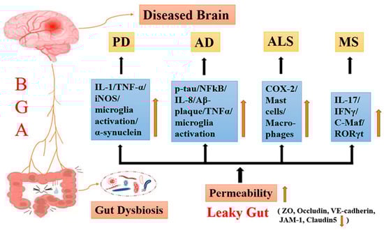 The bidirectional effects of BGA have been studied for an increasing number of neuropsychiatric diseases, including PD [,,], Alzheimer’s disease (AD) [,], amyotrophic lateral sclerosis (ALS) [,,] and multiple sclerosis (MS) [,,]. (1). PD: compared to controls, the faecal aromatic amino acids and branched chain amino acids (BCAAs) concentrations are significantly reduced in PD patients []. Substantial lines of evidence have confirmed that inducible nitric oxide synthase (iNOS) is produced when lipopolysaccharides (LPS) are increased in substantia nigra []. In addition, a damaged gut barrier enhances levels of IL-1β, IL-6 and TNF-α in PD []. Gut dysbiosis induces microglial activation, which leads to the subsequent progression of PD [,]. (2). AD: a meta-analysis showed a significant reduction in gut microbiota diversity in patients with AD compared to healthy controls []. During ageing, the bacteria inhabiting in the gut releases mountains of LPS and amyloids when both the gastrointestinal tract and the BBB are more permeable []. Meanwhile, enhanced gut permeability upregulates the levels of proinflammatory cytokines, such as IL-1β, IL-6, IL-8, IL-12A, IL-18 and TNF-α, in the brain []. A study indicated that Bacteroides fragilis lipopolysaccharides (BFLPS) potentially activates the pro-inflammatory transcription factor nuclear factor-kappaB (NFκB), which leads to inflammation-mediated neurodegeneration []. (3). ALS: a clinical study revealed that compared to their spouses, the gut microbial communities of ALS patients are more diverse and are deficient in Prevotella spp. []. Additionally, due to augmented membrane permeability, increased invasion of macrophages and mast cells, and upregulated levels of cyclooxygenase-2 (COX2) result in inflammation in the brain []. (4). MS: a main pathological characteristic of MS is gut microbiota dysbiosis [,], while the alteration in the gut microbiome reduces C-C chemokine receptor type 9+ (CCR9+) cells, which express transcription factor c-Maf in high levels, leading to an increased expression of retinoic acid-related orphan receptor gamma t (RORγt) and proinflammatory cytokine IL-17/interferon-γ (IFNγ) in secondary progression MS (SPMS) patients [] (Figure 2). Indeed, the impacts of BGA on the above diseases may be related to metabolic regulation and could trigger the release of many inflammatory transcription factors to activate the immune pathway, causing neurodegeneration [,,,,]. However, the relationship between BGA and m6A RNA modification in these diseases is unknown.