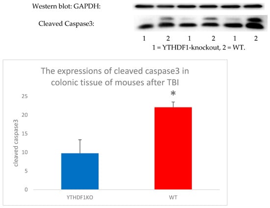 The expressions of cleaved caspase3 in colonic tissue of YTHDF1-knockout mice is significantly downregulated after TBI compared to WT mouses. * p < 0.05.