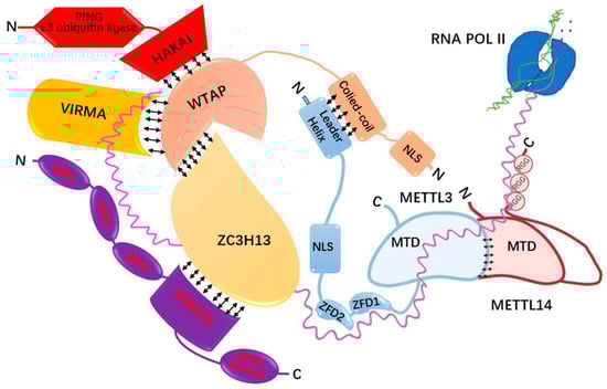 The regulatory mechanism of m6A modification involves a dynamic and reversible process of methylation and demethylation []. M6A modification requires multiple regulatory proteins encoded by writing genes (writers), erasing genes (erasers) and reading genes (readers) [] (Table 1). M6A is catalysed by a writer complex, consisting of core proteins methyltransferase-like 3 (METTL3), methyltransferase-like 14 (METTL14), and Wilms tumour 1-associated protein (WTAP) and several m6A-modified regulatory subunits. The first methyltransferase that binds to S-adenosylmethionine (SAM) in the methylase complex is METTL3 [,]. The binding of METTL3 and METTL14 is colocalised in nuclear spots to form a stable 1:1 heterodimer, which synergistically improves the methylation ability []. METT+L3/METTL14 heterodimers form in the cytoplasm and are recruited into the nucleus through nuclear localisation signals (NLSs) in METTL3 []. METTL3 can interact with the crimped part of WTAP via its lead helix regions and anchor it to RNA in the nucleus, which is rich in specific sites of premRNA processing factors []. WTAP interacts with zinc finger CCCH domain-containing protein 13 (ZC3H13) to keep the methyltransferase complex (MTC) in the nucleus, while ZC3H13 can interact with RNA binding motif protein 15 (RBM15) to recruit the MTC to U-rich sequences adjacent to the sequence RRACH (R = G/A; H = A/C/U) motif []. Another protein that interacts with WTAP is Virma, which provides sequence specificity and MTC recruitment to guide methylation in 3′UTR regions and near-stop codons []. Moreover, methyltransferase-like 16 (METTL16) [], methyltransferase-like 5 (METTL5) and zinc finger CCHC domain containing 4 (ZCCHC4) act as linker proteins to guide MTC binding to its target mRNA []. To date, the last protein in MTC is Hakai, which plays a role in the sex-determining pathway and mediates sex-lethal splicing []. In addition, what is needed to maintain the integrity of m6A-METTL-Associated Complex (MACOM) is the ubiquitin domain of Hakai but not its activity (Figure 5). Hakai is essential to maintaining the functionality of m6A writers by maintaining the stability of MACOM components [].