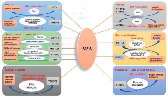 M6A modification is abundant in the brain, normalising the nervous system function by regulating mRNA metabolism. When the expression of key enzymes and/or binding proteins involved in m6A modification is abnormal, the level of m6A modification may fluctuate, leading to molecular dysfunctions such as mRNA metabolism disorder and transcription and translation disorders that cause physiological dysfunction of the nervous system [,,]. Given its diversity and reversibility, m6A modification harbours more complicated physiological mechanisms in regulating CNS functions. For writers, METTL3 can influence the mRNA half-life of Dapk1, Fadd, and Ngfr. Indeed, the deletion of METTL3 can ectopically modify m6A, leading to cerebellar hypoplasia, long-term memory lesion, and effects on the self-renewal and differentiation of stem cells []. METTL14 can recognise and promote Pten protein translation, while METTL14 knockout can affect axonal regenerative ability []. ZC3h13 keeps the Zc3h13-WTAP-Virilizer-Hakai complex in the nucleus and enhances the level of mRNA m6A modification in a mouse embryonic stem cell (mESC). ZC3h13 knockout may cause the complex to be transferred from the nucleus to the cytoplasm, reducing the level of m6A, which destroys the self-renewal of mESCs and induces mESC differentiation []. For erasers, FTO can repress synaptophysin (Syp) gene mRNA transcription in synaptic ganglia and reduce Spy protein levels; downregulating the expression of FTO can also upregulate Syp protein levels and improve memory []. ALKBH5 decreases the m6A modification of C-X-C motif chemokine ligand 2 (CXCL2) and IFN-CD4 mRNA. It increases transcriptional stability and protein expression, which results in the enhanced response of CD4+ T cells and more neutrophils infiltrating the CNS in the process of neuroinflammation []. For readers, YTHDF1 recognises and binds the mRNAs of m6A-modified GRIN1, GRIN2A, GRIA1, CAMK2A, and CAMK2B genes to promote translation. Indeed, YTHDF1 deletion causes ectopic translation of related proteins, resulting in memory loss []. YTHDF2 reduces mRNA stability and facilitates its degradation by recruiting the CCR4-nondead enolase complex. Deleting YTHDF2 in the embryonic neocortex seriously influences the self-renewal of neural stem/progenitor cells (NSPCs). The spatiotemporal generation of neurons and other types of cells leads to death in the later stage of embryonic development []. YTHDF3 can specifically recognise m6A-modified Apc gene mRNA in the cytoplasm and regulate the translation process with YTHDF1. Deleting YTHDF1 and YTHDF3 can cause abnormal translation of Apc protein, which can induce ectopic neuronal development and attenuate synaptic transmission ability []. YTHDC1 plays a role in premRNA splicing and mediates the nuclear and cytoplasmic transport of methylated mRNAs, thus facilitating neuronal survival and reducing ischaemic stroke by destroying PTEN mRNA and promoting Akt phosphorylation []. YTHDC1 knockout downregulates the expression of the antiapoptotic protein Bcl2. It upregulates the expression of the proapoptotic protein cleavage caspase3, while the overexpression of YTHDC1 confirms its protective effect on neuronal death induced by oxygen-glucose deprivation (OGD) []. YTHDC2 can bind to ribosomes and act on small ribosomal subunits, decrease mRNA abundance and enhance HIF-1α mRNA translation efficiency by its helicase []. YTHDC2 can act as an independent gene as a prognostic marker of head and neck squamous cell carcinoma (HNSCC) []. Alteration of m6A modification exerts significant effects on brain tissue development, learning and memory ability, stem cell renewal and differentiation, synaptic regeneration, and other biological functions (Figure 7).
