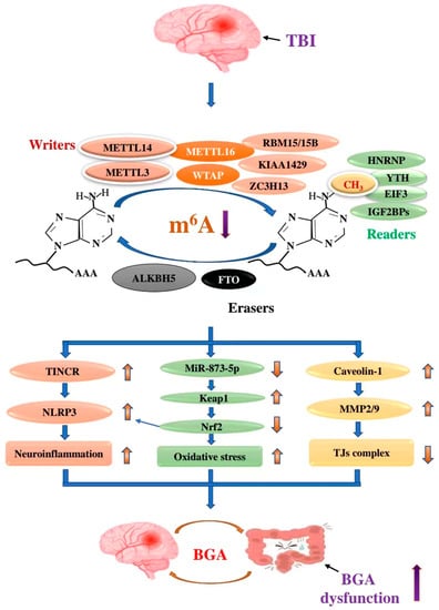 TBI-induced oxidative stress can alter genes expression and signal pathways, such as nucleotide-binding oligomerization domain-like receptor pyrin domain-containing-3 (NLRP3) [], caveolin-1 [], and p75-neurotrophin receptor (p75NTR) [], and nuclear factor erythroid 2-related factor 2 (Nrf2) signalling [,], etc. These alterations may be correlated with posttranscriptional regulation, especially m6A. Considering the indispensable function of m6A modification in mediating protein translation and participating in various bioprocesses, it has been confirmed that m6A modification has also recently contributed to the aetiology and pathogenesis of TBI [,,]. Yiqin Wang et al. investigated novel epigenetic alterations in TBI via genome-wide screening of m6A marker transcripts in the mouse hippocampus after TBI []. The results revealed that the expression of METTL3 and the total level of RNA m6A in the mouse hippocampus were distinctly decreased after TBI. The immunohistochemical results showed that METTL3 was mainly expressed in neurons, suggesting that cognitive dysfunction may be correlated with the downregulation of METTL3. Jiangtao Yu et al. found that the expression of METTL14 and FTO in the rat cortex was decreased after TBI and that there was a significant change in the m6A methylation levels of 1580 mRNAs. The study also revealed that FTO harboured a significant role in maintaining neurological functions in TBI rat that would be an intervention target for mitigating impairments caused by TBI []. However, it is not clear whether the change in TBI-induced m6A methylation is associated with BGA dysfunction.