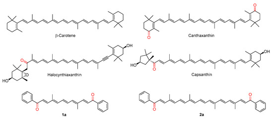 Pursuing the synthesis of strong carotenoid antioxidant, a series of novel ketonic carotenoids (e.g., 1a and 2a in Figure 1) were devised and synthesized by a series of chain-extension and aldol condensation protocols. Antioxidant activities of the ketonic carotenoids using standard DPPH and ABTS radical assays were compared with those of superoxide radical scavenging assays (typically detecting formazan conversion from nitroblue tetrazolium) [27,28,29]. The biggest obstacle in the study of antioxidant activity of the ketonic carotenoids is the fact that their UV absorption wavelengths (496~551 nm) mostly coincide with those of probe molecules such as DPPH radical (517 nm) and formazan (562 nm). This problem can be avoided by separating the probe molecule from ketonic carotenes (or from any other interferences) by HPLC [30] or by choosing a different orthogonal probe system [31]. Herein, we report the details of our studies on the syntheses and anti-oxidant activities of novel oxo-carotenoids.