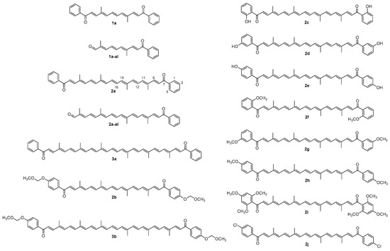 The conditions for double aldol condensation between C20 crocetin dial 2 and acetophenone were then investigated starting with the above optimal condition using NaOH base in MeOH/H2O (10:1) at 25 °C (Table 2). It was surprising that no condensation product was obtained under this condition (entry 1). The homogeneity issue again was decisive. The longer chain of 2 resulted in lower polarity, and removal of water from the reaction medium provided a single condensation product of 2a-al at a 48% yield when LiOMe was used as a base at 25 °C (entry 2). The highest yield (57%) of 2a-al was obtained from the NaOH base in MeOH at 70 °C, while low temperature (−78 °C) reactions with the metal amide bases in THF produced much lower yields (9~13%) of 2a-al (entries 3–5). The reaction using Triton B as a base in MeOH produced no condensation products at 25 °C and no detectible product at 70 °C by decomposition (entries 6 and 7). The double aldol condensation product 2a was finally obtained in 40% yield under a lower polar medium of THF at 25 °C with Triton B as a base (entry 8) [38]. Double aldol condensation of acetophenone with C30 polyene dial 3 was carried out under the above optimum condition of Triton B in THF at 25 °C to give 3a in 25% yield.