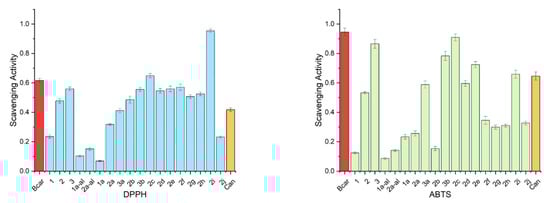 The antioxidant activity of the oxo-carotenoid was represented by the scavenging activity for each probe radical, which was measured as the reduced fraction in the UV absorption peak of each probe by oxo-carotenoids. The scavenging activity values of oxo-carotenoids for DPPH radical (DR), ABTS cationic radical (AR), and superoxide anionic radical (SR) were measured three times and the mean and standard deviation are summarized in Figure 3 (see also Table S1 in Supplementary Materials) together with β-carotene and canthaxanthin as references. It is very interesting to compare the trend of radical scavenging activity of carotenoids in DR/AR (neutral and cationic radical) assays with that of the SR (anionic radical) assay in Figure 3.