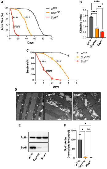 Then, we compared the locomotor behavior of flies through a negative geotaxis-based climbing assay, observing that, with respect to the controls, both Ccsn29E and Sod1n1 lines showed a strong locomotor impairment, with slightly more pronounced effects in the case of Sod1 mutants (Figure 1B). As a further characterization, we analyzed the effects derived by increasing oxidative stress conditions through the addition of paraquat into the food. Paraquat is an herbicide whose toxicity is generally ascribed to the generation of oxidative stress conditions through the production of free radical species, including superoxide and hydroxyl radicals, both at the cytosolic and mitochondrial levels [27,28,29]. Since it was previously shown that in the presence of 2 mM paraquat, Ccsn29E flies display the same extreme hypersensitivity to the redox cycling agent as exhibited by the Sod1n1 line, with less than 5% of survivors after 24 h [25], here, we used a lower concentration of paraquat and measured fly survival for a longer period (4 days). As expected, in the presence of 1 mM paraquat, the absence of Ccs induced a high sensitivity to oxidative conditions in contrast to control flies, whose survival was almost unaffected throughout the time course of the experiment. However, as for the lifespan and the climbing ability, the lack of Ccs produced milder effects than the loss of the Sod1 protein itself (Figure 1C). Given that oxidative stress and mitochondrial damage are often correlated, to further evaluate the consequences of the loss of Ccs, we evaluated the mitochondrial morphology of both Ccsn29E and Sod1n1 mutants and negative controls. In contrast to w1118 control flies and similarly to Sod1n1 mutants, the absence of Ccs in Ccsn29E individuals led to swollen and vacuolized mitochondria characterized by an altered ultrastructure. (Figure 1D). Therefore, the loss of either Ccs or Sod1 largely impacts mitochondrial homeostasis. Since it has been reported that upon Ccs depletion, the Drosophila Sod1 protein becomes unstable and its levels dramatically drop [25], we finally evaluated the amount of Sod1 in Ccs null flies, by immunoblotting. Consistent with the previous report, the loss of Ccs highly impairs Sod1 protein levels (Figure 1E), confirming that Sod1 becomes unstable in the absence of its copper chaperone. Nevertheless, we detected a higher residual amount of Sod1 in Ccs null flies with respect to Sod1n1 mutants (Sod1 levels (mean ± SEM): 6.6 ± 0.5 and 2.1 ± 0.9 in Ccsn29E and Sod1n1, respectively) (Figure 1F), although the difference was not statistically significant, which might explain the less robust phenotypic effects in Ccsn29E as compared with Sod1n1 flies. Overall, our results indicate that the absence of Ccs strongly affects the capability of flies to cope with oxidative stress conditions. Furthermore, taken together, our data confirm that also, in the D. melanogaster model, Sod1 maturation can be achieved through an alternative Ccs-independent pathway.