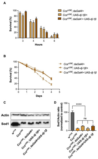 Moreover, the effects induced by the presence of paraquat were very similar between controls and dj-1β-overexpressing flies (Figure 3B). Since, as described above, upon Ccs depletion, Drosophila Sod1 becomes unstable and its levels drop dramatically, we used Sod1 protein levels as an experimental readout to further evaluate the possible participation of dj-1β in the Ccs-independent Sod1 maturation pathway. As represented in Figure 3C, the expression levels of Sod1 in each strain presenting a Ccs null background were very low as comparison with w1118 flies, even in the presence of dj-1β overexpression, excluding, once again, the involvement of dj-1β in the process that leads to the accumulation of the mature form of Sod1.
