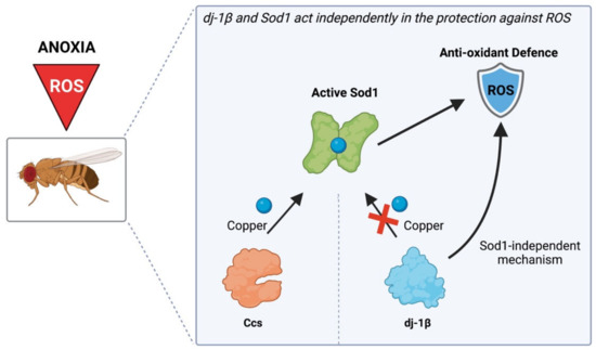 Proposed model describing the independent actions of Sod1 and dj-1β in the protection against anoxia. In Drosophila melanogaster, Ccs is responsible for copper loading into the Sod1 active site through the so-called Ccs-dependent Sod1 maturation pathway. The loss of Ccs increases the susceptibility of flies to oxidative stress. dj-1β does not participate in the Ccs-independent Sod1 maturation pathway, as in a Ccs null genetic background, dj-1β overexpression does not induce any protection. The loss of dj-1β increases the susceptibility to oxidative stress without affecting the Ccs-related Sod1 maturation pathway, as Sod1 levels in dj-1β knock-out flies are similar to controls. Moreover, dj-1β protection appears independent from Sod1 as the modulation of dj-1β expression does not affect Sod1 levels either under basal conditions or in the presence of oxidative stress (created with BioRender.com, accessed on 7 July 2022).