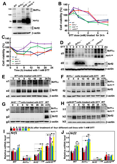 An internal regulatory relationship between Nrf1 and Nrf2 in mediating reductive stress response to DTT. (A) Distinct protein levels of Nrf1 and Nrf2 in four different genotypic cell lines WT, Nrf1α−/−, Nrf2−/−△TA and caNrf2△N were determined by Western blotting with their specific antibodies. (B,C) The viability of these cell lines was detected by the MTT-based assay, after they had been treated with different concentrations of DTT for 24 h (B) or treated with 1 mM of DTT for different lengths of time (C). (D–H) The Nrf1 (d1, e1, f1, g1, h1), Nrf2 (d2, e2, f2, g2, h2) and β-actin (d3, e3, f3, g3, h3) protein expression levels in four genotypic experimental cell lines following intervention with 1 mM of DTT for short times (i.e., 0, 1, 2 h) (D) and long times (i.e., 0, 4, 8, 12, 16, 20, 24 h) (E–H). (I,J) Both Nrf1 and Nrf2 mRNA expression levels in different cell lines that had been treated with 1 mM DTT for distinct time periods (i.e., 0, 4, 8, 12, 16, 20, 24 h) were examined by real-time qPCR. The data are representative of at least three independent experiments, each performed in triplicate. Significant increases ($, p < 0.05; $$, p < 0.01) and significant decreases (* p < 0.05), in addition to non-significance (ND), were statistically determined when compared with the corresponding controls (measured at 0 h), respectively. All protein-blotted bands were also quantified by Quantity One 4.6.2 software, as showed in Figure S1.
