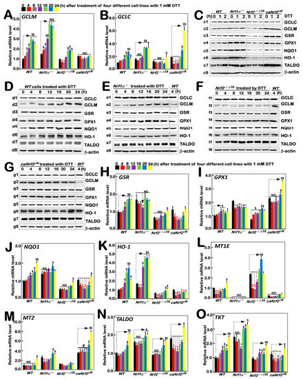 Distinct time-dependent expression of Nrf1/2-mediated redox response genes to DTT in different cell lines. Different genotypic cell lines WT, Nrf1α−/−, Nrf2−/−△TA and caNrf2△N were or were not treated with 1 mM DTT for 0 to 24 h, before both basal and DTT-inducible mRNA levels of all examined genes were determined by RT-qPCR. These genes included GCLM (A), GCLC (B), GSR (H), GPX1 (I), NQO1 (J), HO-1 (K), MT1E (L), MT2 (M), TALDO (N) and TKT (O). The resulting data were shown as fold changes (mean ± SD, n = 3 × 3), which are representative of at least three independent experiments being each performed in triplicate. Significant increases ($, p < 0.05; $$, p < 0.01; $$$, p < 0.001) and significant decreases (* p < 0.05; ** p < 0.01), in addition to the non-significance (ND or #), were statistically analyzed when compared with their corresponding controls (measured at 0 h), respectively. The up and down regulatory changes of different genes after 1 mM DTT intervention can be seen in Figure S5A. These experimental cells were or were not treated with 1 mM for short times (i.e., 0, 1, 2 h) (C) or long times (i.e., 0, 4, 8, 12, 16, 20, 24 h) (D–G), before basal and DTT-inducible protein abundances of GCLC (c1–g1), GCLM (c2–g2), GSR (c3–g3), GPX1 (c4–g4), NQO1 (c5–g5), HO-1 (c6–g6), TALDO (c7–g7) and TKT (c8–g8) were determined by Western blotting with indicated antibodies, whilst β-actin served as a loading control. The intensity of those immunoblots was also quantified by the Quantity One 4.6.2 software, as shown in Figure S2.