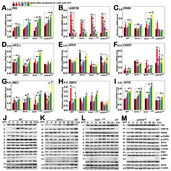 Distinct roles of Nrf1 and Nrf2 in the ER stress response induced by DTT. Four genotypic cell lines of WT, Nrf1α−/−, Nrf2−/−△TA and caNrf2△N were or were not treated with 1 mM DTT for 0 to 24 h, before basal and DTT-inducible mRNA expression levels of those ER stress-related genes were determined by RT-qPCR. Those genes included PDI (A), GRP78 (B), PERK (C), eIF2α (D), ATF4 (E), CHOP (F), IRE1 (G), XBP1 (H) and ATF6 (I). The data were shown as fold changes (mean ± SD, n = 3 × 3), which are representative of at least three independent experiments being each performed in triplicate. Significant increases ($, p < 0.05; $$, p < 0.01) and significant decreases (* p < 0.05; ** p < 0.01), in addition to the non-significance (ND), were statistically analyzed when compared with their corresponding controls (measured at 0 h). The main tendencies of up- and down- regulatory changes of different genes after 1 mM DTT intervention are also shown in Figure S5B. After similar treatment of WT (J), Nrf1α−/− (K), Nrf2−/−△TA (L), and caNrf2△N (M) cell lines for distinct lengths of time (i.e., 0, 4, 8, 12, 16, 20, 24 h), those inducible protein changes of PDI (j1–m1), GRP78 (j2–m2), PERK (j3–m3), p-PERK (j4–m4), p-eIF2α (j5–m5), ATF4 (j6–m6), CHOP (j7–m7), β-actin (j8–m8), IRE1 (j9–m9), p-IRE1 (j10–m10), XBP1 (j11–m11), ATF6 (j12–m12) and β-actin (j13–m13) were determined by Western blotting with indicated antibodies, whilst β-actin served as a loading control. The intensity of those immunoblots, representing different protein expression levels, was also quantified by the Quantity One 4.6.2 software, as shown in Figure S3.