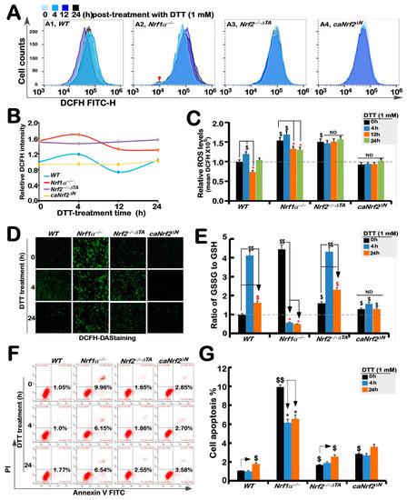 Changes in both ROS levels and ratio of GSSG to GSH are accompanied by distinct apoptosis of different genotypic cell lines against DTT. (A) Experimental cell lines WT, Nrf1α−/−, Nrf2−/−△TA and caNrf2△N were treated with 1 mM DTT for different time periods (i.e., 0, 4, 12 and 24 h), before they were subjected to flow cytometry analysis of their intracellular ROS levels by the DCFH-DA fluorescence intensity. The data for ROS products and differences were further analyzed by FlowJo 7.6.1 software, as shown in (B,C). (D) After DCFH-DA staining, the ROS fluorescent images in different cell lines were obtained under microscope. (E) Measurements of the intracellular GSH and GSSH levels were performed and also repeated three times, each of which was performed in triplicate. Statistical significances were calculated: $$, p < 0.01, and $, p < 0.05 indicate significant increases by comparing each basal value of [Nrf1α−/−]T0, [Nrf2−/−△TA]T0, and [caNrf2ΔN]T0 with that of [WT]T0, while both * p < 0.05 denote significant decreases in those values from each of the cell lines treated by DTT for 4 h (i.e., [X]T4) or 24 h (i.e., [X]T24) versus its untreated [X]T0 value in the same groups. (F) Distinct cell lines of WT, Nrf1α−/−, Nrf2−/−△TA and caNrf2△N were (or were not) treated with 1 mM DTT for different lengths of time. Subsequently, the cells were incubated with a binding buffer containing Annexin V-FITC and propidium iodide (PI) for 15 min, before being subjected to the flow cytometry analysis of apoptosis. (G) The final results were shown by the column charts, which were representative of at least three independent experiments, each performed in triplicate. Of note, $$, p < 0.01, and $, p < 0.05 indicate significant increases in each basal value of [Nrf1α−/−]T0, [Nrf2−/−△TA]T0, and [caNrf2ΔN]T0 with that of [WT]T0, while both * p < 0.05 denote significant decreases in those values from each of the cell lines treated by DTT for 4 h (i.e., [X]T4) or 24 h (i.e., [X]T24) versus the untreated [X]T0 value in the same groups.