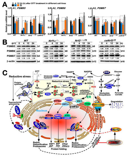 The following supporting information can be downloaded at: https://www.mdpi.com/article/10.3390/antiox11081535/s1, Figure S1: An internal regulatory relationship between Nrf1 and Nrf2 in mediating reductive stress response to DTT.; Figure S2: Distinct time-dependent expression of Nrf1/2-mediated redox response genes to DTT in different cell lines; Figure S3: Distinct roles of Nrf1 and Nrf2 in the ER stress response induced by DTT; Figure S4: Nrf1 stability and trans-activity were determined by redox status of its Cys342 and Cys640; Figure S5: The overall regulation of differential expression genes in distinct cell lines after DTT treatment.