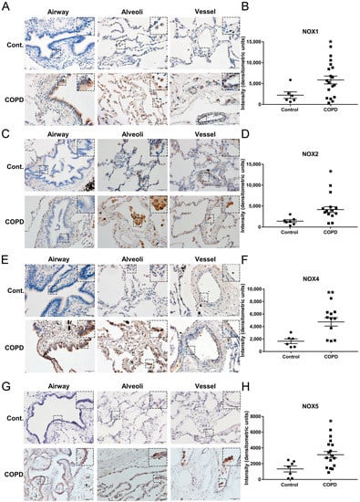 3.1. The Protein Expression of NOX Isoforms NOX1, NOX2, NOX4, and NOX5 Was Significantly Upregulated in Lung Tissue Sections of Patients with End-Stage COPD