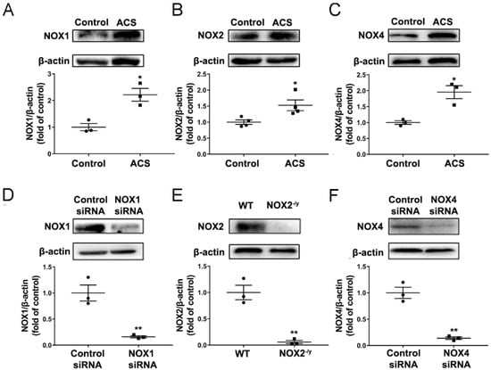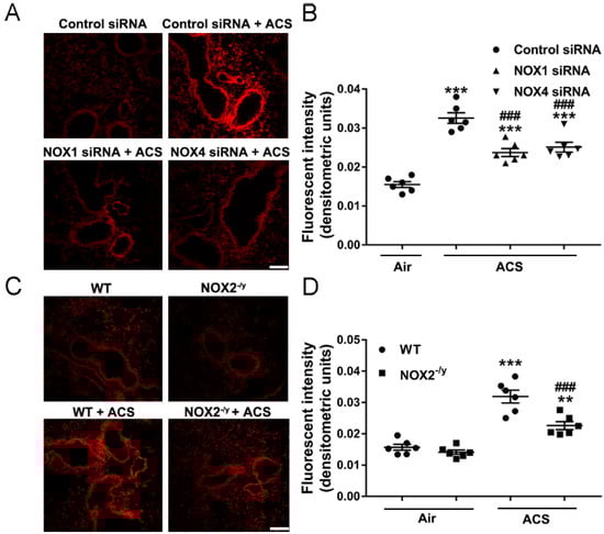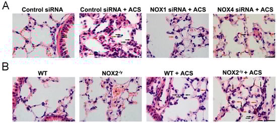 siRNA specifically designed to target mouse NOX1 or NOX4 was purchased from Dharmacon (Chicago, IL, USA) with the sequences [5′- > 3′] NOX1: GCUGGUGGCUGGUGA CGAAUU; NOX4: CAUGCUGCUGCUGUUGCAUGUUUCA). siRNAs were prepared in Invivofectamine 3.0 reagent (Invitrogen, Carlsbad, CA, USA) for in vivo delivery as we previously published []. In brief, 100 μL of 1.2 mg/mL siRNA solution was mixed with 100 μL Invivofectamine 3.0 reagent. After incubation at 50 °C for 30 min, the mixture was diluted six-fold by adding 1 mL of phosphate-buffered saline (PBS). Subsequently, this mixture was injected into mice via the tail vein (1 mg siRNA/kg body weight) 24 h before exposing mice to ACS. Liposome-based transfection reagents have been shown previously to successfully deliver siRNA to the mouse lung to attenuate gene expression [].
