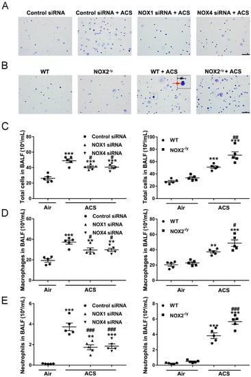 Knockdown of NOX1 or NOX4 in mice attenuated ACS induced inflammatory cell accumulation in BALF. Mice were exposed to CS or filtered air for 1 h, and BALF was collected at 6 h. Cells isolated from BALF were counted with a hemocytometer and stained with Giemsa. (A) Representative images of cells in BALF from ACS exposed mice transfected with control siRNA, NOX1 siRNA, or NOX4 siRNA. (B) Representative images of cells in BALF from ACS exposed WT mice and NOX2−/y mice. (C) Total cell counts in BALF in ACS exposed mice silenced or knocked out of NOX1, NOX2, or NOX4 expression. (D) The number of macrophages (red arrowhead) in ACS exposed mice silenced or knocked out of NOX1, NOX2, or NOX4 expression. (E) The number of neutrophils (black arrowhead) in BALF in ACS exposed mice silenced or knocked out of NOX1, NOX2, or NOX4 expression. All data are presented as Mean ± SEM, n = 5. Scale bar, 50 µm. ** p < 0.01, *** p < 0.001 vs. air exposed control group. # p < 0.05, ## p < 0.01, ### p < 0.001 vs. ACS exposed group.