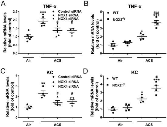 Knockdown of NOX1 or NOX4 in mice attenuated ACS induced upregulation of pro-inflammatory mediators in the mouse lung. Mice were exposed to CS or filtered air for 1 h and harvested at 6 h. The mRNA expression levels of (A,B) TNF-α and (C,D) KC in the lungs of ACS exposed mice silenced or knocked down of NOX1, NOX2, or NOX4 were determined by RT-qPCR. The data indicate that ACS induced upregulation of TNF-α/KC in mouse lungs was significantly attenuated in NOX1- or NOX4-silenced mice, while it was increased in NOX2−/y mice. All data are presented as Mean ± SEM, n = 4–5. * p < 0.05, ** p < 0.01, *** p < 0.001 vs. air exposed control group. # p < 0.05, ### p < 0.001 vs. ACS exposed group.
