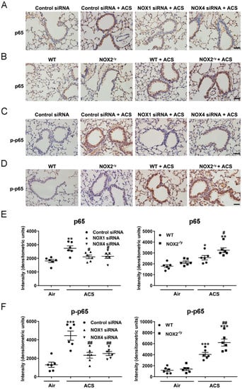 Knockdown of NOX1 or NOX4 attenuated ACS induced NF-κB activation in the mouse lung. Mice were exposed to CS or filtered air for 1 h and harvested at 6 h. Shown are representative immunohistochemical images of p65 (A,B) and p-p65 (C,D) expression in ACS exposed mice silenced or knocked out of NOX1, NOX2, or NOX4. Quantitative data of p65 and p-p65 expression in ACS exposed mice silenced or knocked out of NOX1, NOX2, or NOX4 are shown in panels (E,F), respectively. The data indicate that ACS induced activation of NF-κB was significantly attenuated in NOX1- or NOX4-silenced mice, while it was increased in NOX2−/y mice. All data are presented as Mean ± SEM, n = 6. Scale bar, 50 µm. * p < 0.05, ** p < 0.01, *** p < 0.001 vs. air exposed control group. # p < 0.05, ## p < 0.01 vs. ACS exposed group.