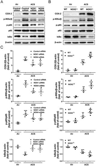 Knockdown of NOX1 or NOX4 attenuated ACS induced activation of the NF-κB-COX-2 pathway in the mouse lung. Mice were exposed to CS or filtered air for 1 h and harvested at 6 h. Western blotting was used to examine COX-2, p-IKKα/β, p-p65, p65, and IκBα protein expression in mouse lungs. (A,B) Representative Western blots of COX-2, p-IKKα/β, p-p65, p65, and IκBα protein expression in ACS exposed mice silenced or knocked out of NOX1, NOX2, or NOX4. (C) Grouped data of COX-2, p-IKKα/β, p-p65, p65, and IκBα protein expression in ACS exposed mice silenced or knocked out of NOX1, NOX2, or NOX4. The data indicate that ACS induced activation of the NF-κB-COX-2 pathway was significantly attenuated in NOX1- or NOX4-silenced mice, while it was increased in NOX2−/y mice. All data are presented as Mean ± SEM, n = 3–5. * p < 0.05, ** p < 0.01, *** p < 0.001 vs. air exposed control group. # p < 0.05, ## p < 0.01 vs. ACS exposed group.