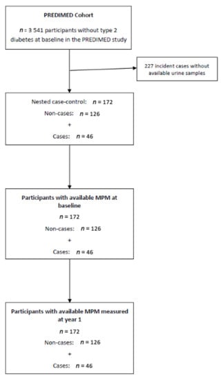 This work was performed as a pilot case-control study nested within the PREDIMED trial, a multicenter, parallel-group, randomized, controlled trial that evaluated the effect of the MeDiet on the primary prevention of cardiovascular disease (CVD) on women and men ranging in age from 55 to 80 years at high cardiovascular risk but free of CVD at baseline. Participants (n = 7447) were randomized into three intervention groups: Extra-virgin olive oil-supplemented MeDiet, mixed nuts-supplemented MeDiet, and low-fat control diet. Details on the study protocol can be found in Martínez-González et al., 2012 [] and at http://www.predimed.es (accessed on 16 March 2022). One of the secondary outcomes of the study was incidence of type 2 diabetes; out of 3541 participants free of diabetes at baseline, 273 developed the disease during 4.1 years of follow-up []. For the present case-control study, we included a random selection of 172 participants from all eligible subjects of the PREDIMED study who were free of diabetes at baseline and with available urine samples at baseline and after one year of follow-up, of whom 46 were incident cases of type 2 diabetes and 126 were non-cases (Figure 1).