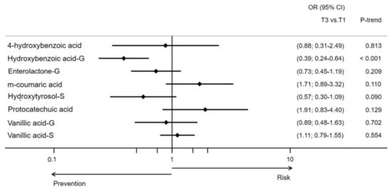 An increase in 4-hydroxibenzoic acid was observed in urine after an intervention with organic products (more than 80% of the diet coming from organic supermarkets) carried out by our group [], as well as an increase of constituents from the hydroxybenzoic acid family after different types of (polyphenol-rich) foods such as oranges, cocoa, and almonds, or beverages like green tea, coffee, and red wine []. In addition, a prior study within the PREDIMED cohort showed that intake of hydroxybenzoic acid, among other (poly)phenols, was correlated with a lower incidence of type 2 diabetes []. These results lead to the hypothesis that not only might this polyphenol family be related to type 2 diabetes, but its circulating concentrations are related to the dietary pattern and the gut microbial population [].