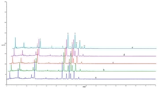 HPLC profiles of extracts from the navel orange peels dried by different drying methods. The letters from a to e, represent FD, SD, OD50, OD70, and MD, respectively. The number above the peak represent the following compounds: (1) narirutin, (2) hesperidin, (3) didymin, (4) isosinensetin, (5) 3,3′,4′,5,7,8-hexamethoxyflavone, (6) sinensetin, (7) 4′,5,7,8-tetramethoxyflavone, (8) 3,3′,4′,5,6,7-hexamethoxyflavone, (9) nobiletin, (10) 4′,5,6,7-tetramethoxyflavone, (11) 3,3′,4′,5,6,7,8-heptamethoxyflavone, (12) 5-hydroxy-6,7,3′,4′-tetramethoxyflavone, (13) tangeretin.