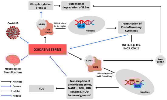 - Bhandari, R.; Khanna, G.; Kaushik, D.; Kuhad, A. Divulging the intricacies of crosstalk between NF-Kb and Nrf2-Keap1 pathway in neurological complications of COVID-19. Mol. Neurobiol. 2021, 58, 3347–3361. [Google Scholar] [CrossRef]