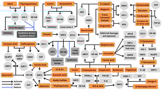 | Thymoquinone | Quinone | Nigella sativa | Activates Nrf2 which decreases ACE2 expression and inhibits NF-κβ | [146,147] |