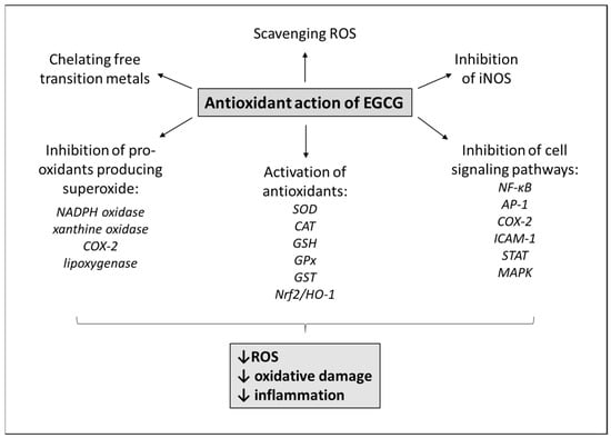 As mentioned before, a relatively large area of the lungs is exposed to huge amounts of ROS in inhaled air or produced by activated immune cells in the lungs [64]. ROS are created by metabolizing organelles, especially by mitochondria, peroxisomes and endoplasmic reticulum [65], and under normal conditions, small concentrations of produced ROS are eliminated by antioxidant systems [66]. However, a shift towards oxidative stress triggers various signaling pathways which stimulate both inflammation and carcinogenesis, such as transcription factors nuclear factor (NF)-κB, activator protein (AP)-1, signal transducer and activator of transcription (STAT)3, protein kinases such as mitogen-activated protein kinase (MAPK) or c-Jun NH2-terminal kinase (JNK), cell adhesion molecules such as intercellular adhesion molecule (ICAM), cyclooxygenase (COX)-2, and many others [67,68,69,70]. The majority of the mentioned pathways can be modulated by EGCG, which thereby alleviates inflammation and cell proliferation [71,72,73]. Nevertheless, exceptional property of flavonoids including EGCG is their complex antioxidant action supplied by several mechanisms [74,75] (Figure 2).