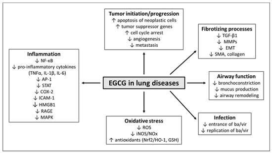 Major effects of EGCG in the lung diseases. Abbreviations: AP-1: activator protein 1, ba: bacteria, COX-2: cyclooxygenase-2, EGCG: epigallocatechin-gallate, EMT: epithelial–mesenchymal transition, GSH: glutathione, iNOS: inducible nitric oxide synthase, HMGB1: high-mobility group box 1, HO-1: heme oxygenase-1, ICAM-1: intercellular adhesion molecule, MAPK: mitogen-activated protein kinase, MMPs: matrix metalloproteinases, NF-κB: nuclear factor kappa-B, NOx: nitric oxide metabolites, Nrf2: nuclear factor erythroid-derived 2-like 2, RAGE: receptor for advanced glycation end products, ROS: reactive oxygen species, SMA: smooth muscle actin, STAT: signal transducer and activator of transcription, TGF-β1: transforming growth factor-beta1, TNFα: tumor necrosis factor alpha, IL-1β: interleukin-1beta, vi: viruses.