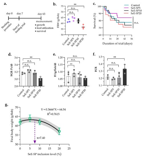 Growth performance and feed intake of juvenile seabass fed various levels of selenium-enriched spirulina (SeE-SP). (a) Timeline of feeding trial followed by seven days of conditioning fish in feeding tank; (b) Final body weight (FBW); (c) Survival; (d) specific growth rate (SGR); (e) feed intake (FI); (f) feed conversion ratio (FCR) of fish after 56 days of feeding trial; (g) the highest SeE-SP level for the maximum FBW was 7.40% in the diet, as determined by quadratic regression analysis. Values are mean ± SE of three replicate tanks (indicated as dots on bars) per treatment. The bars with asterisks (**) are significantly different based on Tukey’s multiple range test (One-way ANOVA, p < 0.05). ns, non-significant at p < 0.05.