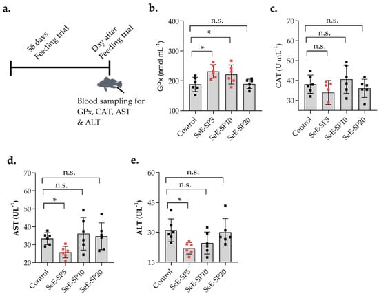 Serum antioxidant response and liver enzymatic activities of juvenile seabass fed various levels of selenium-enriched spirulina (SeE-SP). (a) Timeline of feeding trial and blood collection; (b) glutathione peroxidase (GPx); (c) catalase (CAT); (d) aspartate aminotransferase (AST); and (e) alanine aminotransferase (ALT) of fish following 56 days of experimental feeding. Values are mean ± SE of three replicate tanks per treatment (values of individual fish per group are indicated as small squares on the bars). Bars holding asterisk (*) are significantly different based on Tukey’s multiple range test (One-way ANOVA, p < 0.05). ns, non-significant at p < 0.05.