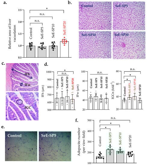 Liver and fat cells histomorphology of juvenile seabass fed various levels of selenium-enriched spirulina (Se-SP). (a) Measurement of liver vacuolation; (b) representative hepatic images of fish fed various levels of SeE-SP diets (H&E, 40 × magnification); (c) Schematic representation of histometric measurement of intestinal fold height (IFh), fold width (IFw) and intestinal goblet cell number (IGCn) (H&E, 40 × magnification); (d) quantification of IFh, IFw, and IGCn of the distal intestine of seabass (values are mean ± SE of three replicate tanks per treatment, while values of individual fish per group are indicated as dots on the bars); (e) representative adipose tissue (fat cells) histology (H&E, 40 × magnification); and (f) quantification of adipocyte number in fish fed various levels of SeE-SP diets (values are mean ± SE of three replicate tanks per treatment, while values of individual fish per group are indicated as small dots on the bars). Bars holding asterisk (*) are significantly different based on Tukey’s multiple range test (One-way ANOVA, p < 0.05). ns, non-significant at p < 0.05.